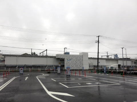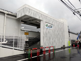 | 駅舎というか、駅入口回りに若干駅舎的施設があります。こちらは南口で、おそらく正面側。駅前には市道が走っており、その向かいに仮の送迎車用ロータリーがあります。(R7.9撮影) |