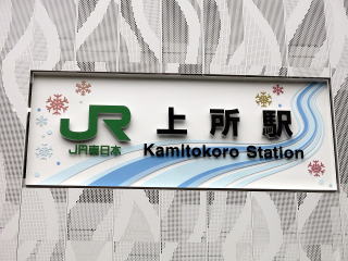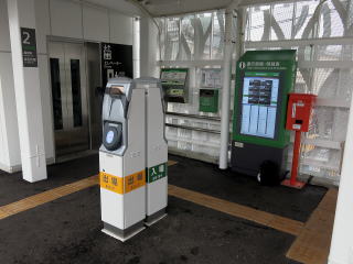 | 駅に入った箇所には乗車駅証明書発行機、着札箱、Suicaリーダーと情報表示器があります。 | ホームは2面2線。待合はホームにベンチがあるだけですが、下りホームには画像にあるオリジナルのベンチが一つあります。 | ||||||||||||||||