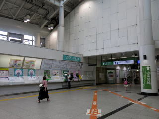 | 駅舎前にはペディストリアンデッキがあります。一部駅前ロータリーの屋根機能も兼ねています。 | 駅舎内コンコース。駅ビル併設なので商業施設が並び賑やかです。 | |||||||||||||||||||||