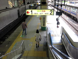 | 急行線ホーム1・2番。常磐線・成田線方面への快速ですが、2番は折り返し日暮里方面列車乗り場です。 | JRホームから見る京成線ホーム。同一構内のように見えますが、中間改札があります。 | |||||||||||||||||||