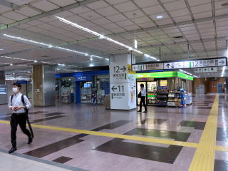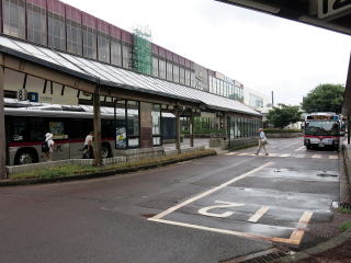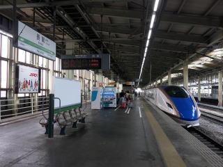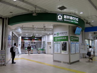 | 駅前にバスターミナルがあります。このバスターミナルがあること、駅舎の中央に公園的な歩行者通路があり、駅前の奥行きがないことから、全景が捕らえづらい駅舎です。 | 駅舎入口。若干改修されていますが、全般的に昭和57年の上越新幹線開業時の施設で、古さは否めません。 | |||||||||||||||||||