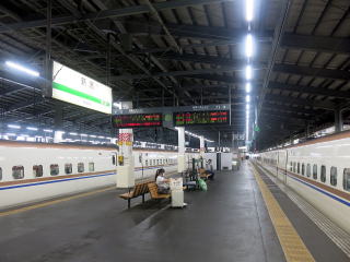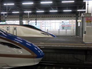 | ホームは3面4線。島式ホームで幅が広い割りに構築物が少なく、若干空虚です。 | 在来線も高架化され、同レベルに在来ホームが見えます。羽越本線方面在来特急接続のため11番線の在来線側に片面ホームが追加され、平面乗換が可能となりました。 | |||||||||||||||||||