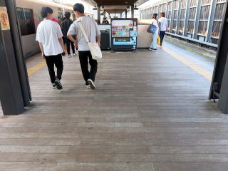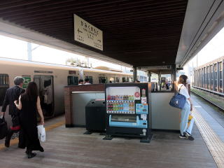 | 駅舎内にはショッピング街を併設しています。本屋、百円ショップ、コンビニ、歯科医などが入っています。 | ホームは1面2線。駅全体が和装ですが、自販機やくずもの入れもシックな濃い茶です。 | |||||||||||||||||||||