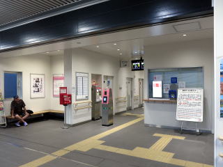 | 駅舎内。自由通路に面したコンコース。窓口、待合と、ICカードリーダーの改札口があります。 | ホームは1面2線です。駅舎の改築によりホームが1面減りました。 | ||||||||||||||||