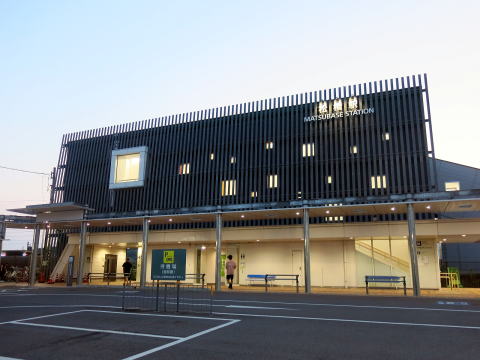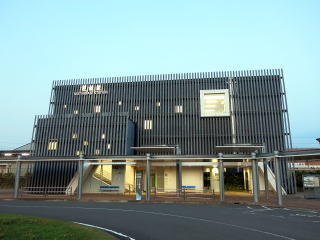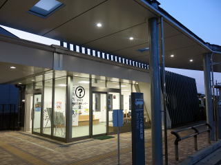 | 平成28年に改築された橋上駅舎です。大小の四角の窓が特徴ですが、タテルーバー越しに、薄暮時は室内の照明が点灯するためよく映えます。こちらは正面の東口です。(R7.8撮影) |