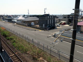 | 跨線橋は2・3番ホーム側は二股の階段です。停車列車が短編成となった今、乗り場は上下でズレています。 | 構内裏手は新しい団地があり、前回訪問時は広大な空き地でした。昭和33年に廃止された日産化学工業専用線の跡地です。 | ||||||||||||||||