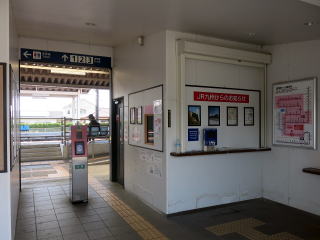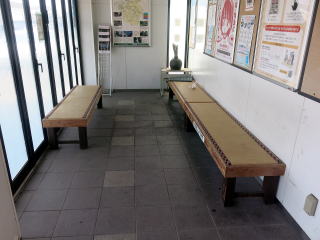 | 改築当初は窓口があったようですが、完全に閉鎖されてしまっています。 | ガラス張りの区画は待合室です。八代平野の駅らしくタタミ張りのベンチに、奥の鉢には藺草が挿されていました。 | ||||||||||||||||