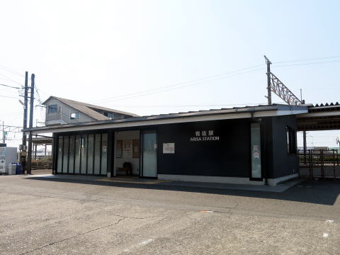 | 平屋建ての新しい木造駅舎。片流れ屋根と左辺のガラス面が特徴です。旧駅舎のシロアリ被害のため平成26年に改築されました。(R7.8撮影) |