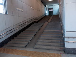 | 橋上駅舎の階段には自転車用スロープもあります。その分蹴上げが低く、歩行者は歩きにくいです。高校も至近にあり、純然たる自由通路の意味合いもあるようです。 | こちらは南口。新幹線駅舎前と共用の「南口広場」に面します。 | |||||||||||||||||||