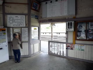 | 軒下にある駅舎入口。手前に木製駅名板があり、駅名板が通常ある入口上部には名所案内板があります。 | 駅舎内。窓口がありますが、この訪問の2か月前に閉鎖され、無人化されました。券売機が入っています。 | ||||||||||||||||