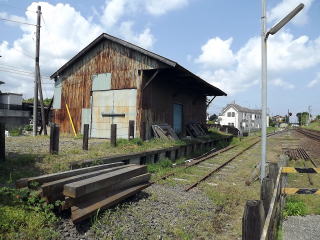 | 対向ホームである下りホームは簡素な鉄骨基礎ホーム。入口も鋼製のタラップです。 | 構内上り方に貨物ホーム跡と留置線があります。保線用にでも使用されているのではないでしょうか。 | ||||||||||||||||