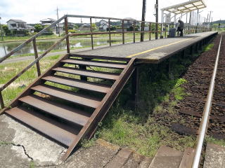 | 駅舎裏にも大きな軒下があり、ベンチが置かれます。ホームとは接していません。 | 駅舎とホームの間には広い階段があります。この左手にスロープもあります。 | ||||||||||||||||