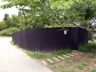 | 多目的トイレの手間に大きな囲いがありますが、これは平成24年に整備された「自然の中のトイレ」。この中にガラス張りのトイレブースが一つあります。 | ホームは1面1線です。桜の木に覆われますが、夏場はちょっと鬱蒼としています。 | ||||||||||||||||