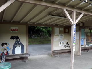 | 駅舎というか、ホーム待合室内。周囲の森の雰囲気からかトトロのイラストが描かれています。 | ホームは1面1線です。駅の下り方が森に面しますが、上り方は田畑地帯です。 | ||||||||||||||||
