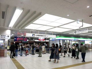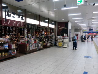 | 改札内の通路。大きな土産物屋がありますが、焼酎などの酒類主体のようでした。 | 改札内コンコース。錯視を利用した案内標示があります。 | ||||||||||||||||||||||