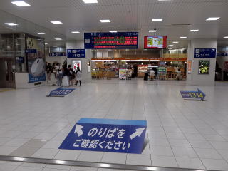 | 駅舎内1階に大きな木。「出会い杉」という待ち合わせ場所です。 | 改札は2階にあります。新幹線改札前のコンコース。在来改札もこの左に並んであります。 | ||||||||||||||||||||||