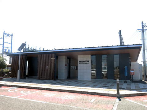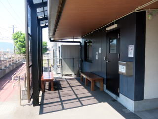 | 平成28年に、県道の拡幅工事のために改築されました。小さな平屋建ての駅舎。木造ではないかと思うのですが。右手は駅待合室で、左手はトイレです。(R7.8撮影) |