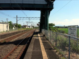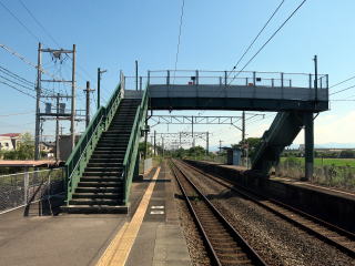 | ホームは2面2線です。駅舎裏へ出る裏口がありますが、ロータリーなどはなく駐輪場があるばかりでした。 | ホーム跨線橋は無蓋、カギ型のもの。ホームも若干千鳥配置です。 | ||||||||||||||||