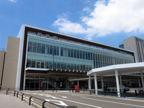 | 前面ガラス張りで直線基調の特徴的な駅舎。新幹線開業前の平成30年の改築です。こちらは正面口にあたる東口で、右手に接続するのは商業施設兼ホテル。駅前にはバスターミナルのあるロータリーがあります。(R7.8撮影) |