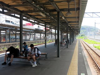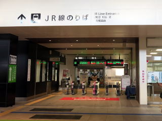 | 駅舎内。自由通路兼コンコース。右手に窓口、在来改札、駅事務室、新幹線改札、券売機、待合室と並んでいます。 | 在来改札口。左手に駅事務室があり、その裏に新幹線との乗り換え改札があります。 | ||||||||||||||||||||||||
