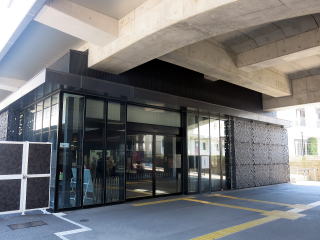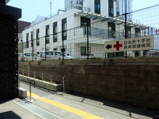 | 駅入口。高架の下が入口となっています。 | 高架の裏手側にはすぐに日赤病院があり、細々とした裏口があります。高架下の駅向かいには調剤薬局が入っています。 | |||||||||||||||||||||