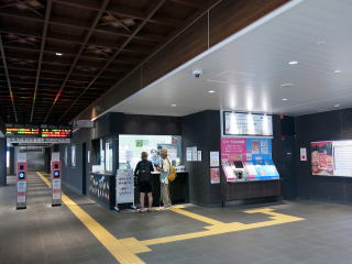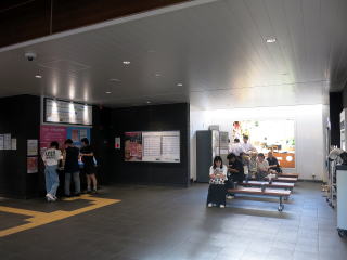 | 駅舎内。みどりの窓口が営業しています。改札は改札機ではなくICカートリーダーです。 | 駅舎内には待合室や売店はありません。待合コーナーにベンチが並びます。 | |||||||||||||||||||||
