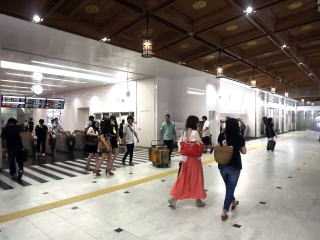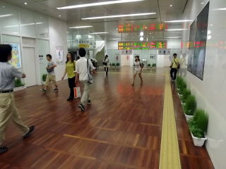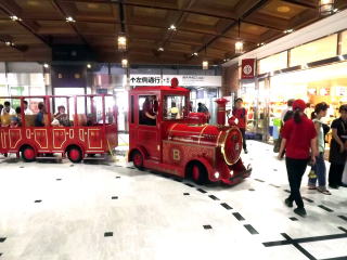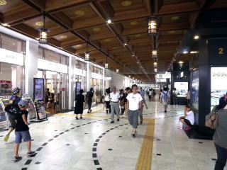 | コンコースを走る、公園や観光地で稀に見かける遊具の列車。常時いるのか分かりませんが、レールのようなルートが床に描かれています。 | 改札正面の1番ホームは折り返し特急列車が使用します。広く、カーブしたホームです。 | |||||||||||||||||||||