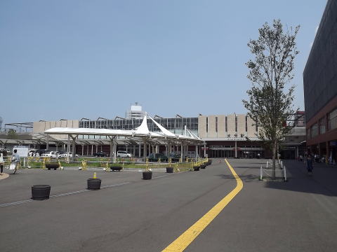 | 高架駅です。平成24年に構内の全面高架化が完成しました。こちらは高架化により新設された、言わば裏口の「上野の森口」。訪問時正面口となる現「府内中央口」はまだ旧駅舎解体直後で、現在はこちら側からも見える巨大駅ビル「JRおおいたシティ」が建てられています。(H25.8撮影) |
