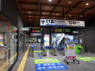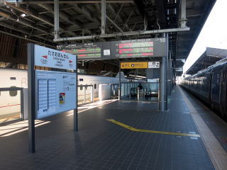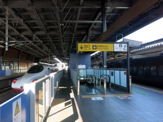 | ホームは1面2線。左手が新幹線用11番線、右が在来のリレー特急用10番線で、号車番号も合わせた平面乗換えができます。敦賀駅もこうできなかったのは本数の問題でしょうか。 |