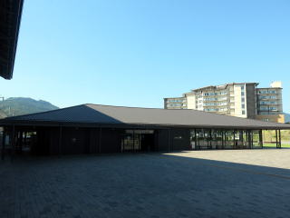 西口駅前には大きな物産販売所があります。道の駅施設と兼ねているようです。奥に見えるのは温泉宿ではなく、総合病院です。 |