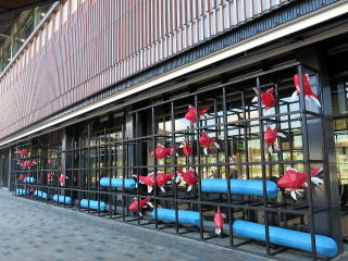 | 駅舎前には紙細工風の、川の流れと金魚のオブジェ。嬉野市の、旧塩田町地区は鍋野和紙が名産です。 |