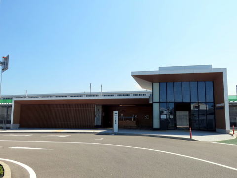 | 平屋建ての鉄骨造の駅舎。駅舎区画は一番右の背の高い区画で、左の背の低い区画はオープンの待合所とトイレです。駅前には小さなロータリーが整備され、コミュニティバスの乗り場があります。(R7.8撮影) |