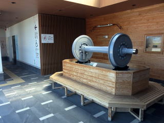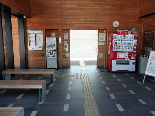 | オープンの待合所区画。ベンチが置かれ、オブジェとして列車の車輪が飾られています。 | 駅舎内。壁面は木製、ベンチも木製です。前面、左面はガラス張りです。 | ||||||||||||||||
