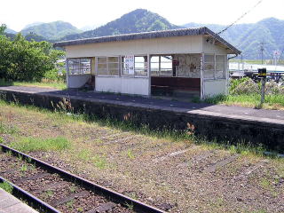 | 青い瓦屋根の木造駅舎。車寄せが大屋根から連続する形状は島根県内の山陰線でも見られます。旧駅事務室には運送会社の事務所が入っています。(H17.5撮影) |
