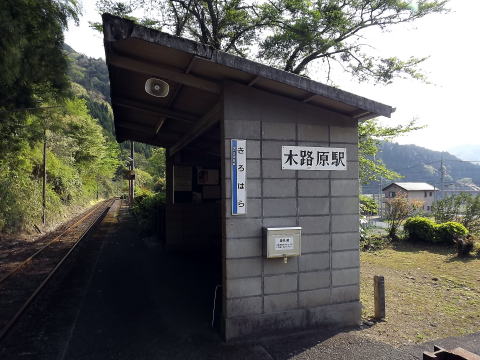 | 待合室の内部。木製ベンチに座布団が置かれて一応人の気配が感じられます。 | 駅入口に木路原八幡宮という神社があり、町指定天然記念物の大きなムクの木があります。 | ||||||||||||||||