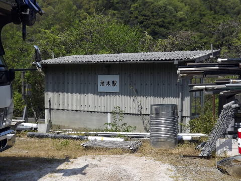| 駅舎はありません。ホーム待合室の背に駅名表示がありますが、工務店の庭先に面しており、埋もれてしまっているような佇まい。公道から撮っています。(H19.5撮影) |