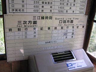 | B級名物駅として駅ノートがあります。設置者はサイト「秘境駅へ行こう」の牛山氏です。その他Web上で著名な方々の書き込みも散見されました。 | 上りは朝の2本、下りは午後の3本という三次市街部指向の通勤通学ダイヤです。列車で出入りすると口羽側からは日帰りできません。 | ||||||||||||||||