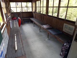 | 駅舎内。内部は居心地の良さ、薄気味悪さ、人によって評価が分かれそうです。 | 窓は木枠です。築堤上にあるので県道越しに眺める江の川が見渡せます。 | ||||||||||||||||