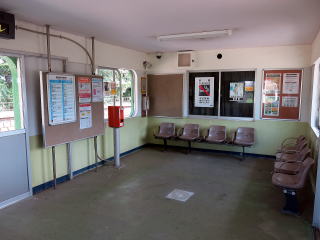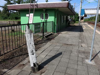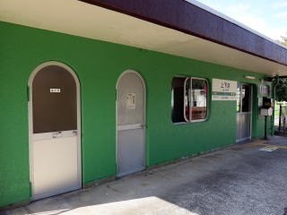| 駅舎内。窓口跡がありま塞がれています。簡易型の券売機が入っていましたが、なくなっています。 | 駅舎ホーム側。待合の窓や旧駅事務室やトイレなどのドアも丸く加工されています。割りとデザインに力を入れた駅舎です。 | |