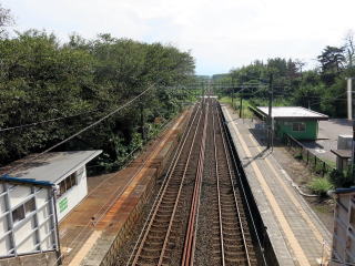 | 国道と高速道路にはまれた狭い立地にある駅。駅周囲はラーメン屋が1軒ある程度で、おいしそうなニンニクのにおいが漂っていましたが居酒屋に変わっていました。小学校などもある集落が国道の西側に広がっており、決して無人地帯ではありません。 |