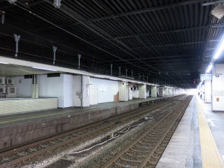 | 2・3番ホームは駅舎・新幹線ホームの下にもぐり込みます。そのため在来構内は狭く見えます。 | 駅舎下には更に、乗り場としては欠番となっている1番線があり、使用されていない1番ホームもあります。現在下り貨物用通過線となっています。 | |||||||||||||||||||