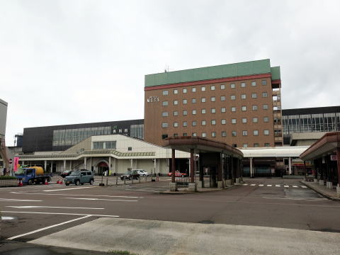 | 駅の裏手側となる東口。橋上駅舎ですが、駅舎とは自由通路を介します。JR系列のホテルを併設しています。裏手とは言ってもバスターミナルがあって、商業施設にも隣接し正面ほどではありませんが賑わいはあります。(R7.9撮影) |