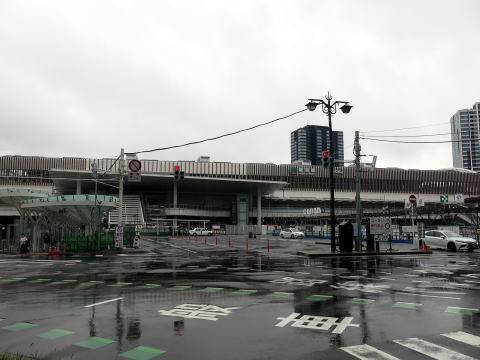 | 令和4年に開設された高架駅舎。正面側に当たる万代口です。工事は平成30年に開始され、訪問時はまだ正面口や駅前の工事はまだ残っていました。どこか無機質になりがちな高架駅舎ですが、タテルーバーと暖色系を使用し、暖かみのある外観となっています。(R7.9撮影) |